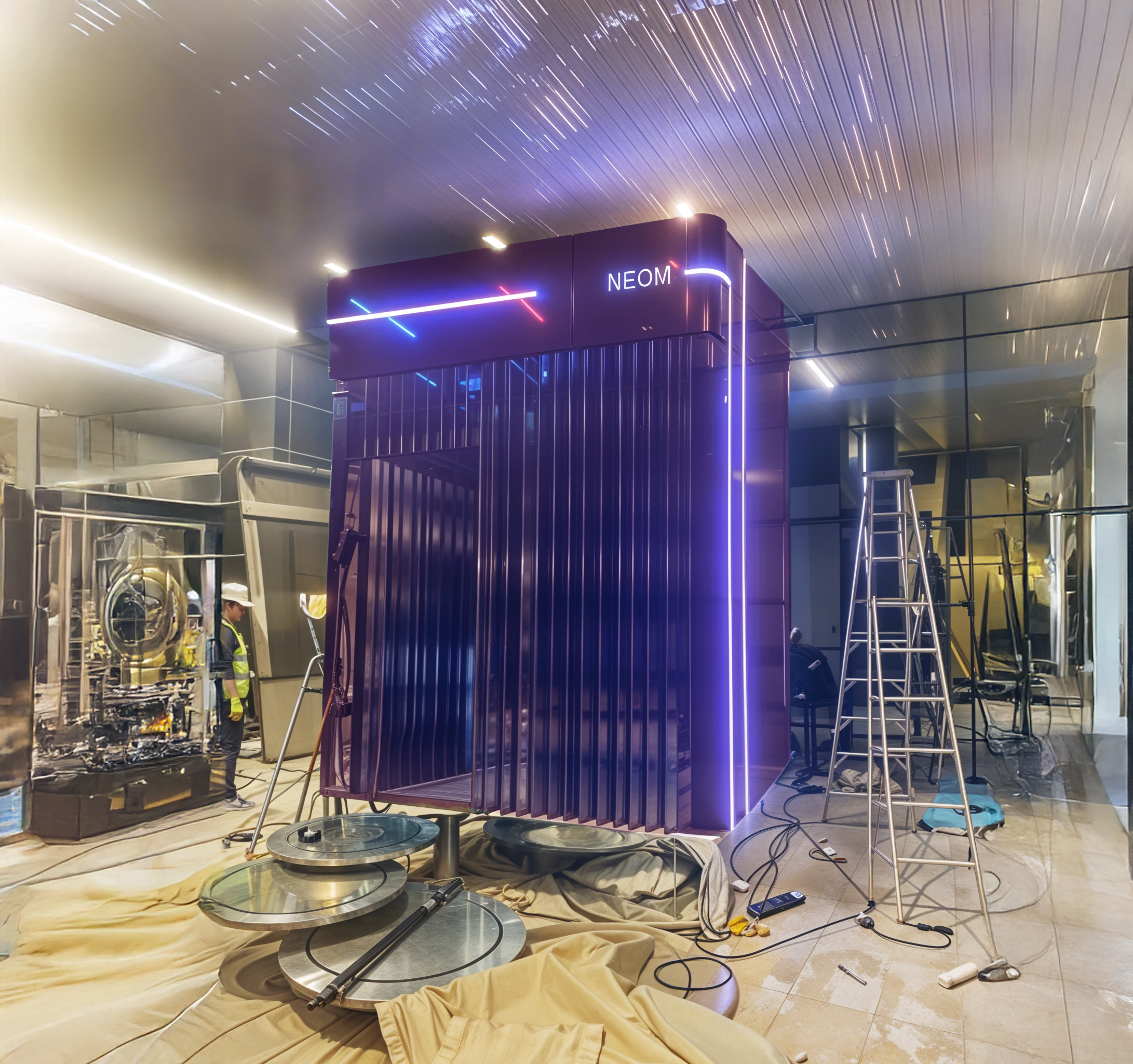 What sets the NEOM Pod apart is its futuristic design, featuring a gradient exterior that adapts to sunlight throughout the day, transitioning between hues of red, blue, green, and yellow. Its mirrored base creates the illusion of a floating structure, blending harmoniously with its surroundings while maintaining a bold presence.